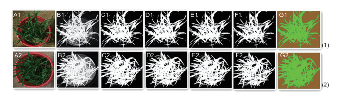 圖4 .兩種土壤條件下FVC提取效果:(1) 干土條件;(2) 濕土條件。A1和A2:可見光圖像;B1和B2:NDVI灰度圖像;C1和C2:通過干土閾值(T0)提取的灰度圖像;D1和D2:通過DPK-means算法提取的灰度圖像;E1和E2:通過濕土閾值(T1)提取的灰度圖像;F1和F2:通過整體閾值(T2)提取的灰度圖像;G1和G2:通過SVM算法提取的灰度圖像。