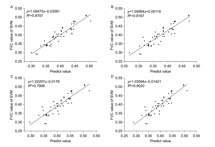 對四種方法提取的FVC結(jié)果進行線性擬合,結(jié)果如圖5所示。其中,SVM提取的FVC值代表通過支持向量機算法提取的FVC值,而預(yù)測值則表示不同方法提取的FVC值。從圖5-A至D可以看出,DPK-means算法的擬合精度最高,其R²達到了0.87。