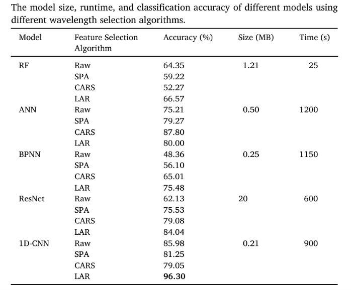基于LAR算法選擇的特征波段,結(jié)合MC預(yù)處理,進(jìn)一步比較了1D-CNN與RF、ANN、BPNN和ResNet模型的分類結(jié)果(見下表),發(fā)現(xiàn)LAR-1D-CNN不僅在準(zhǔn)確率上大幅領(lǐng)先(96.3%),且模型體積最?。?.21MB),運(yùn)行效率更高。