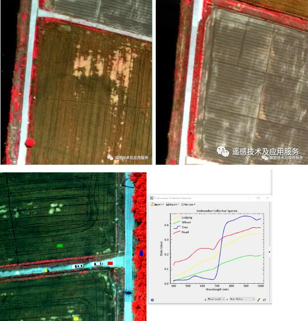 圖4 機(jī)載高光譜系統(tǒng)數(shù)據(jù)采集偽彩色圖及地物光譜曲線