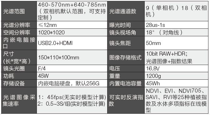 地面光譜成像指數(shù)分析儀:分單相機(jī)成像光譜儀和雙相機(jī)成像光譜儀,單相機(jī)的光譜范圍及通道數(shù)等如表1 所示。雙相機(jī)是將表1 中兩個(gè)多譜段相機(jī)通過**技術(shù)在不降低空間分辨率下實(shí)現(xiàn)18~32 個(gè)波段的圖像與光譜數(shù)據(jù)的融合。地面成像光譜儀的性能參數(shù)如表2 所示。