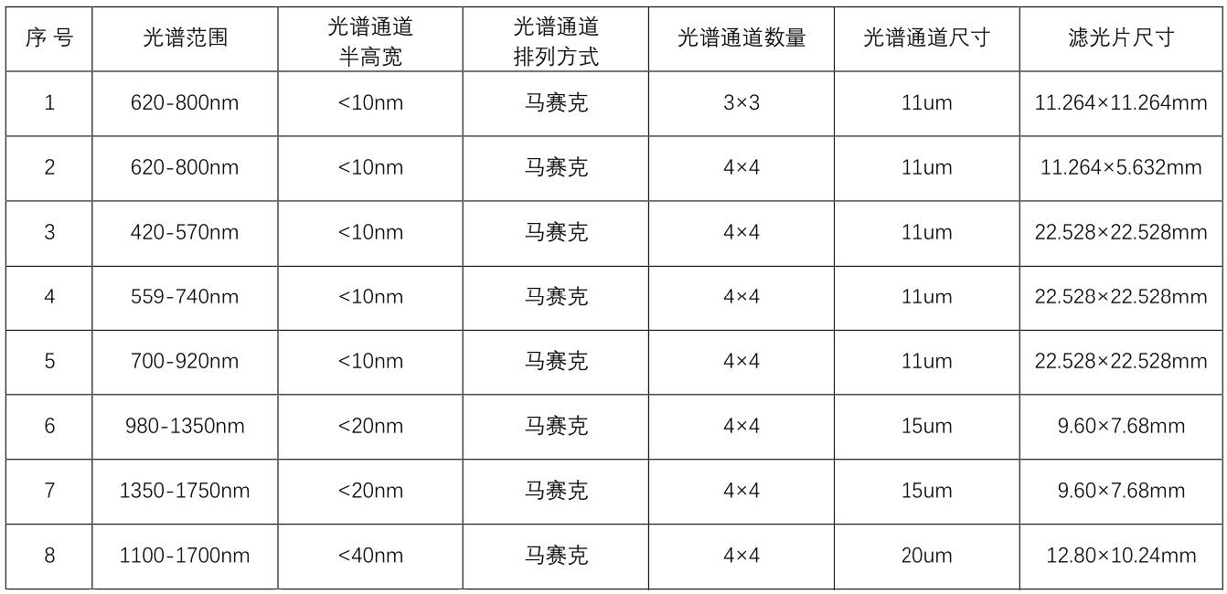 表1 像元級(jí)光譜濾光片產(chǎn)品種類