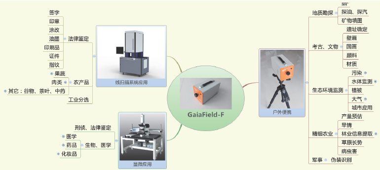 GaiaField 系統(tǒng)有著輕便靈活,續(xù)航能力出色、智能化、數(shù)據(jù)分析處理功能齊全、能夠?qū)崟r監(jiān)控等特點。廣泛適用于戶外和實驗室內(nèi)的應(yīng)用需求,例如:目標探測與識別、偽裝與反偽裝等軍事領(lǐng)域,地面物體與水體遙測、現(xiàn)代精細農(nóng)業(yè)等生態(tài)環(huán)境監(jiān)測領(lǐng)域,刑偵、文物保護、生物醫(yī)學(xué)、塑料垃圾、煙草煙葉的工業(yè)分選,化學(xué)氣體燃燒火焰、地質(zhì)礦石分析,油氣巖層熒光分析等等領(lǐng)域。