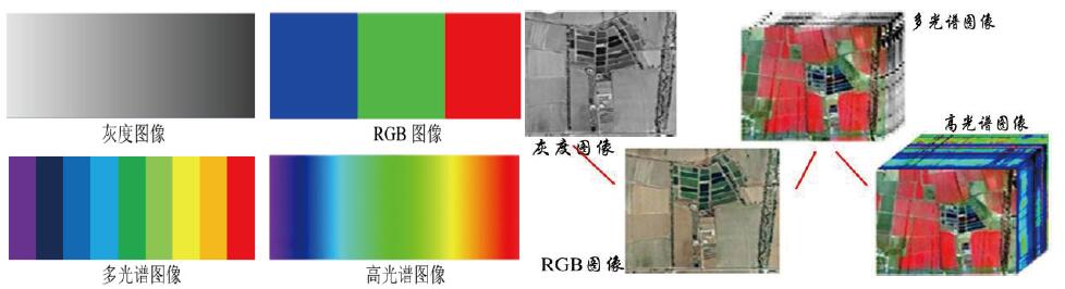 (左圖)灰度圖像、RGB圖像、多光譜圖像和高光譜圖像波段數(shù)對(duì)比;