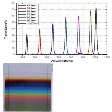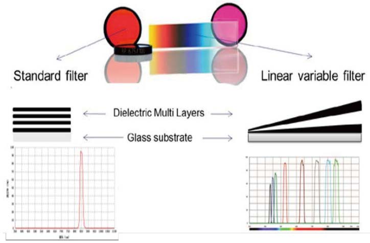 濾片式光譜相機(jī)利用特殊的鍍膜技術(shù),無(wú)需分光光譜儀模塊,使得在光譜覆蓋范圍內(nèi)的數(shù)十或數(shù)百條光譜波段對(duì)目標(biāo)物體連續(xù)成像。在獲得物體空間特征成像的同時(shí),也獲得了被測(cè)物體的光譜信息。漸變薄膜式高光譜相機(jī)是將不同波段的漸變薄膜鍍制在面陣探測(cè)器上, 通過(guò)對(duì)目標(biāo)成像,可同時(shí)、快速獲取光譜和影像信息的無(wú)損檢測(cè)分析儀器。